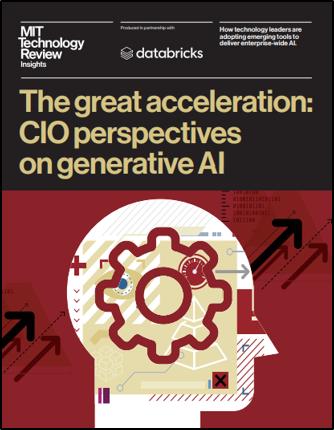 This new MIT Technology Review Insights report is based on interviews with the CIOs of Adobe, Shell, DuPont, Cosmo Energy and Kansas City Veterans Affairs Medical Center — as well as an MIT professor and Matei Zaharia, Co-founder and CTO, Databricks. Combined with the results of a global AI survey of 600 CIOs, this report gives you strategic insights on enterprise adoption of generative AI.